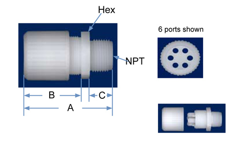 | PVDF Part No. | Tube O.D. | NPT Size | Ports | Orifice | A | B | C | Hex |