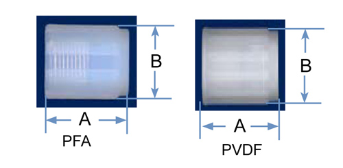| PFA Part No. | Tube O.D. | A | B | PVDF Part No. | A | B |
